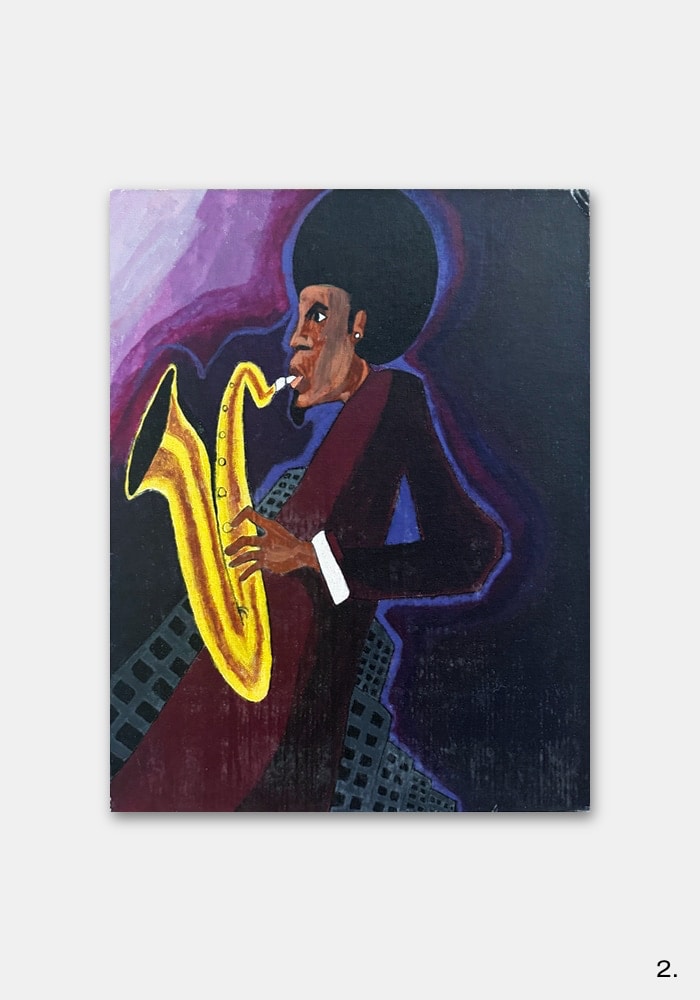 2. "Untitled (Saxophonist Outdoors at Night)," date unknown, artist unknown, purchased at an antiques store. 18 x 14 inch acrylic or oil on canvas board, mounted to stretcher.